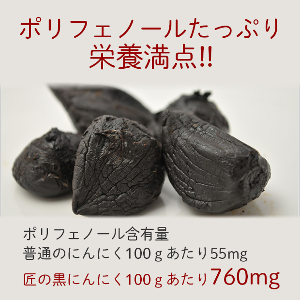発芽にんにくを独自の発酵製法で熟成させました。 ポリフェノールたっぷり栄養満点!! フルーティーな感覚ですにんにくの匂いを気にせずに召し上がれます。 ポリフェノール含有量は、普通のにんにくが100gあたり55mgなのに対して匠の黒にんにくは100gあたり760mgです。 賞味期限:3か月間 保存方法:直射日光または高温所を避け冷暗所にて保存